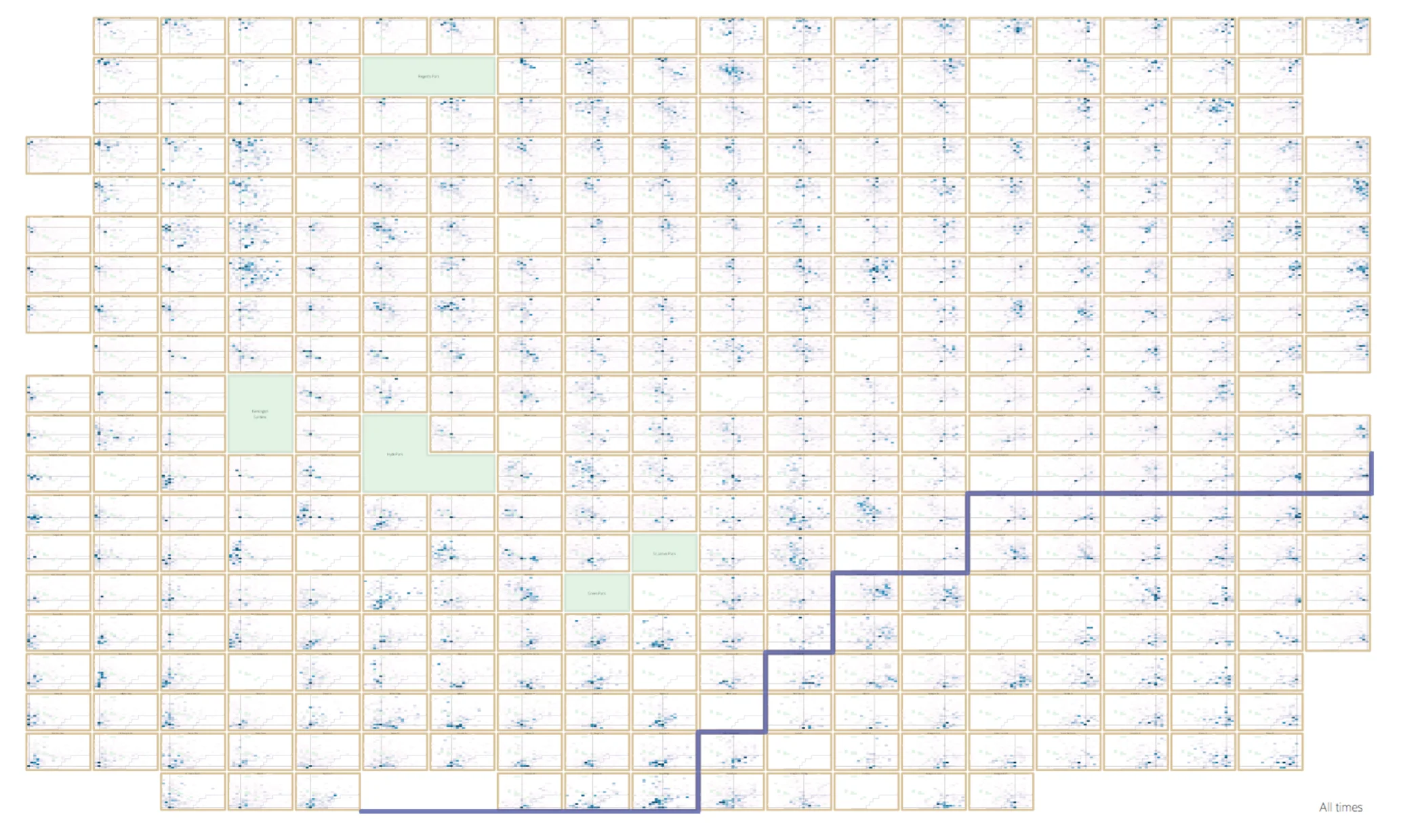 Fig 1b. OD Map map showing journeys made between docking stations of the London Cycle Hire Scheme between 21st September – 20th October 2011. Local variations can be more easily identified. Notice the large geographic spread of destinations (row 7, column 4) that can be distinguished from the localised travel from neighbouring docking stations (row 7, column 5). Figure previously appeared in Wood et al. (2011).