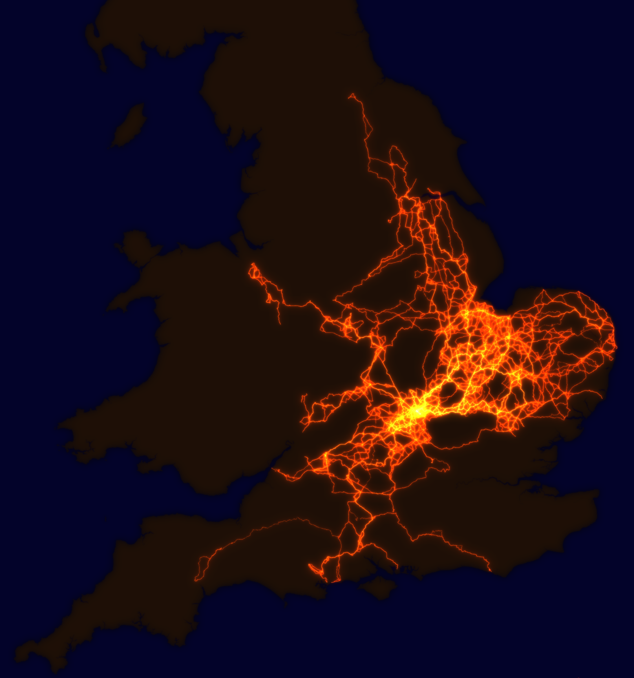 In 2015 Steve Abraham rode 63,565 miles (102,298 km) on his bicycle. This heatmap shows where he rode over the year. Using GPS tracking data, the heatmap records the density of visits at a 200m grid resolution. His home location of Milton Keynes is apparent along with flatter routes around England notably avoiding larger cities and the hillier regions of the country such as the Chilterns, the Peak District and Pennines